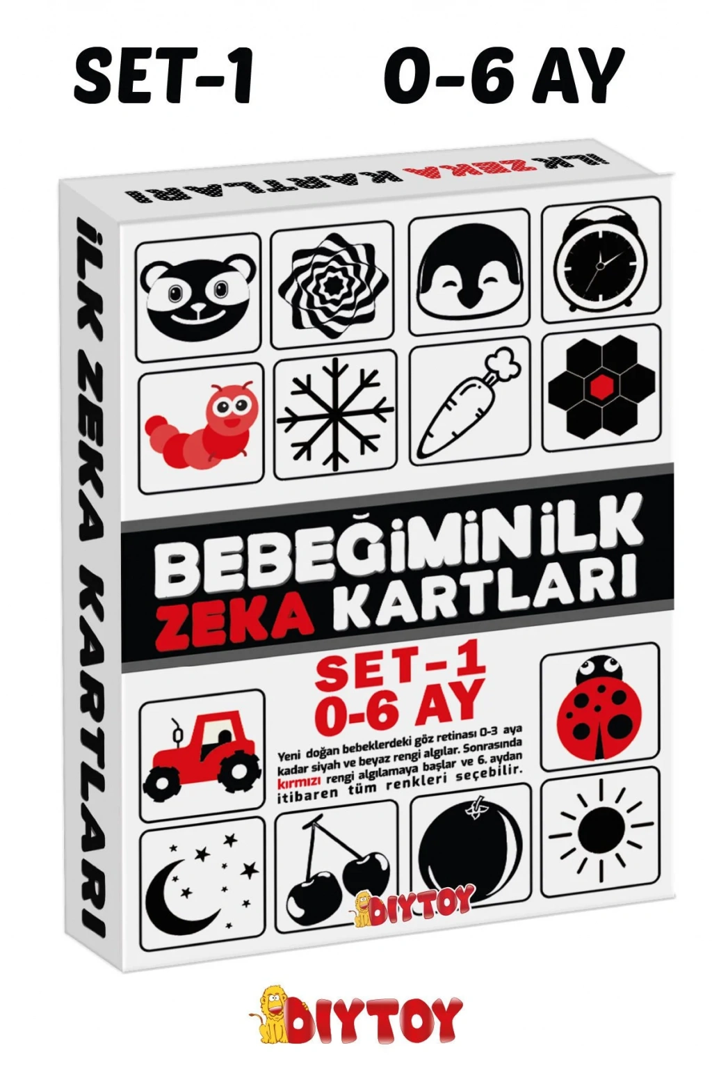 Diytoy Bebeğimin ilk zeka kartları, 0-6 ay dönemindeki bebeklerin gelişimine odaklanmış görsel gelişim setidir. Bu dönemde bebeklerin göz retinası renkleri siyah ve beyaz olarak algıladığı için doğrudan siyah-beyaz kontrast odaklı tasarlanmıştır. Özellikle ilk üç ayda siyah ve beyaz renkleri daha net görme yetenekleri düşünüldüğünde 0-6 ay zeka kartları özellikle görsel zeka gelişimine katkı sağlarlar. 6. aydan itibaren kırmızı renkler algılanmaya başlar ve setin içerisindeki kırmızı renkli kartlar ile renk algılarını geliştirmeye yöneliktir. Kartların 16,5 cm uzunluk ve 1mm kalınlık değeri bebeklerin kolay tutması için tasarlanmıştır.