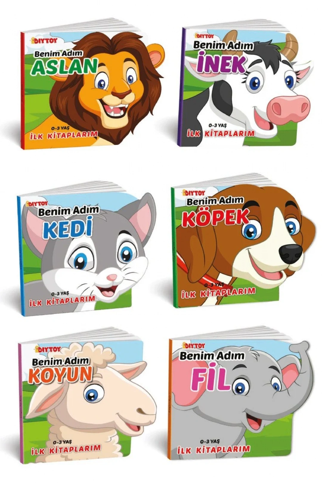 Set içinde 6 ayrı kitap bulunur: “Aslan”, “İnek”, “Fil”, “Kedi”, “Köpek”, “Koyun” temalı hayvanlar.