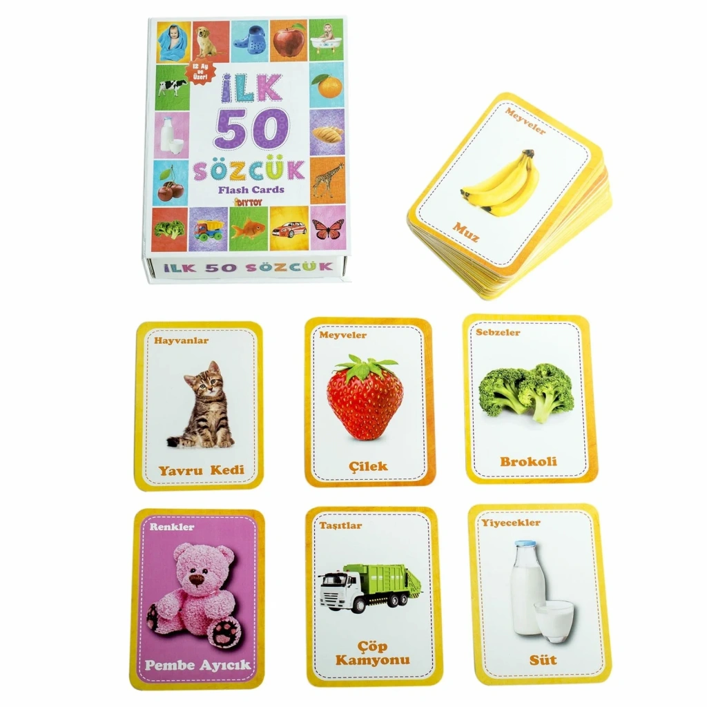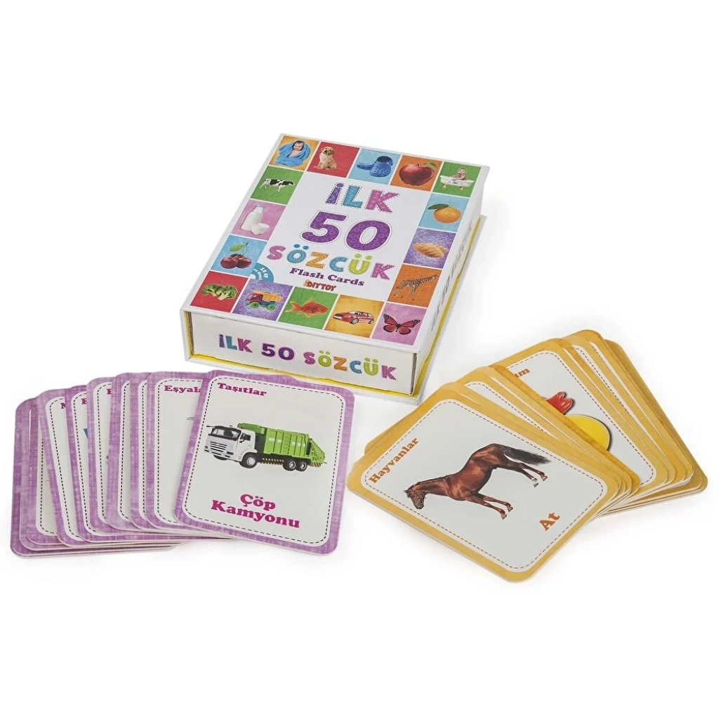 Diytoy İlk 50 Sözcük Eğitici Kartlar bebeklerin ve küçük çocukların erken yaşta kelime dağarcığını geliştirmesi için özel olarak hazırlanmış eğitici bir kart setidir. Günlük hayatta sıkça karşılaşılan nesneler, hayvanlar, yiyecekler ve temel kavramlardan oluşan bu set; çocukların konuşma öncesi ve konuşma döneminde kelime tanıma, dikkat ve hafıza gelişimini destekler.