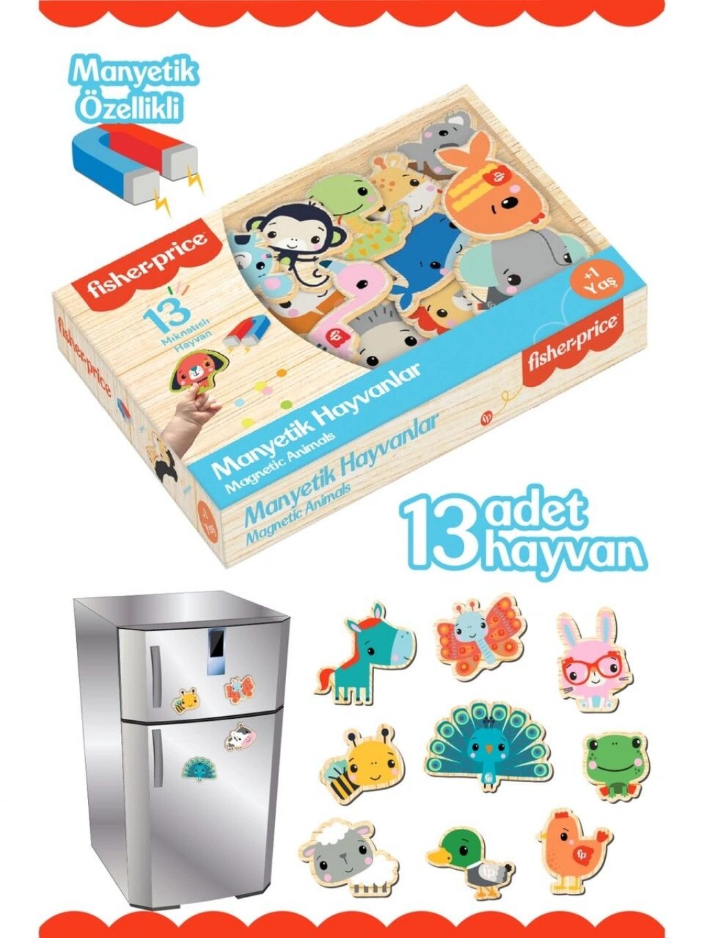 Fisher-Price Manyetik Hayvanlar seti, çocukların hayvanları eğlenerek tanımasını sağlayan 13 parçalık eğitici bir manyetik oyuncak setidir. Renkli ve dikkat çekici hayvan figürleri sayesinde çocuklar hem hayvan isimlerini öğrenir hem de oyun yoluyla görsel hafıza ve kavram gelişimini destekler.